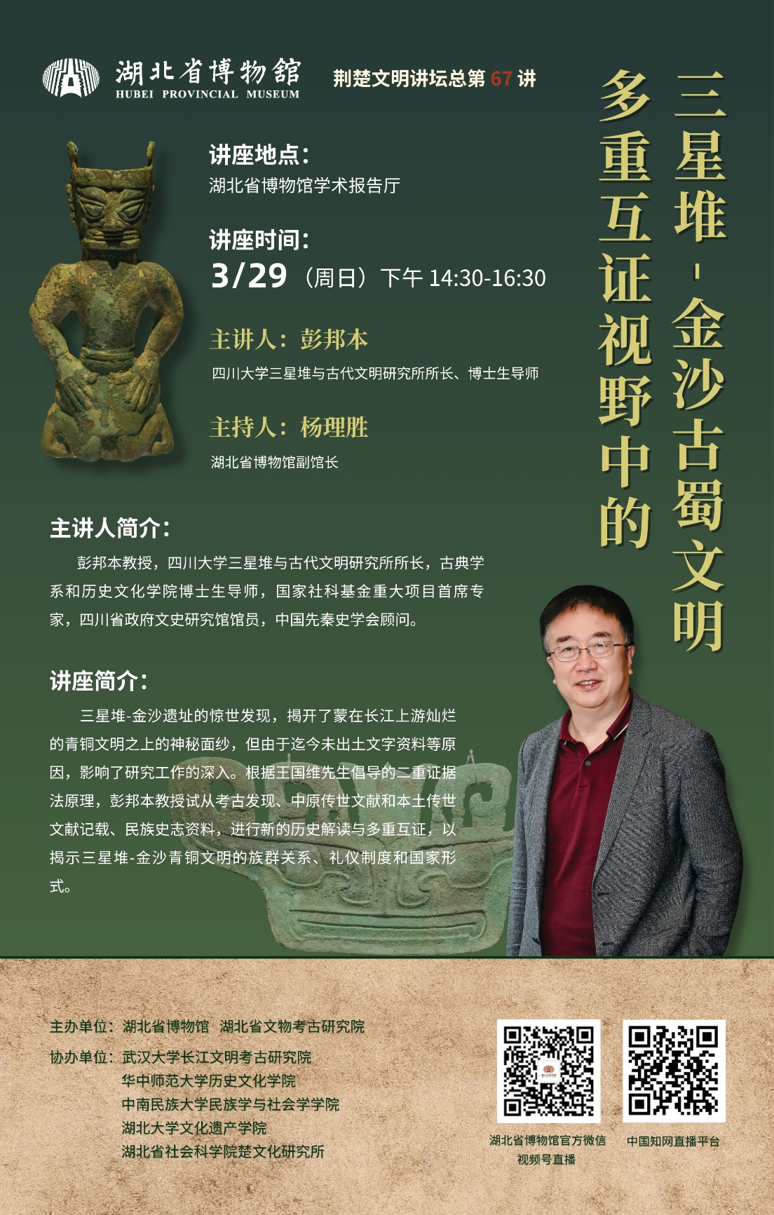 主讲人简介:彭邦本教授,四川大学三星堆与古代文明研究所所长,古典学系和历史文化学院博士生导师,国家社科基金重大项目首席专家,四川省政府文史研究馆馆员,中国先秦史学会顾问。