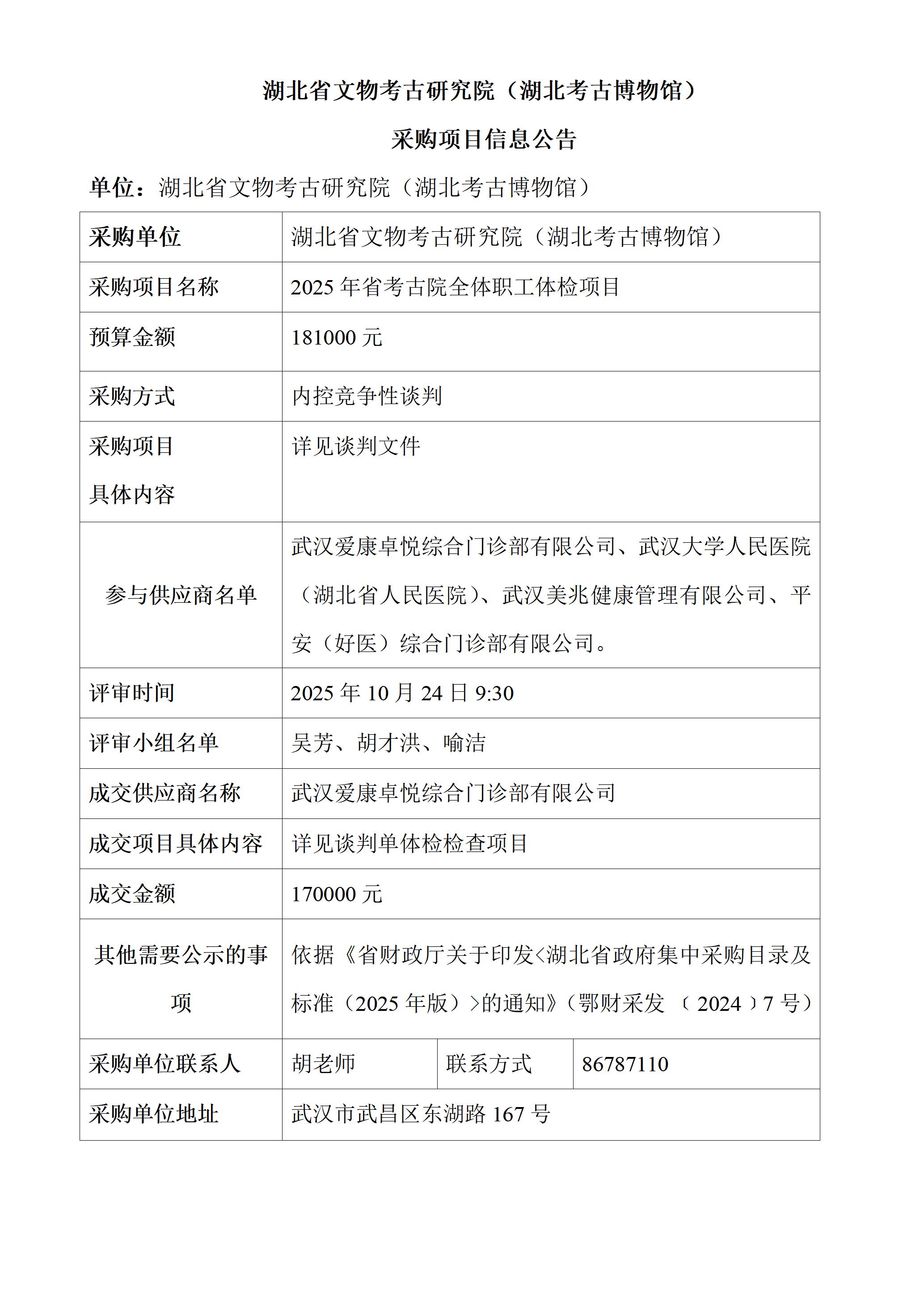 湖北省文物考古研究院(湖北考古博物馆) 采购项目信息公告-2025年省考古院全体职工体检项目